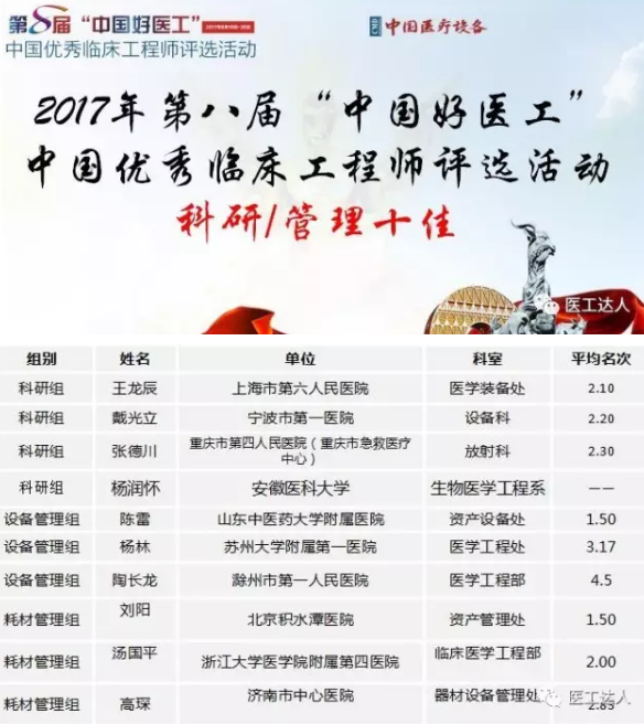 “中国好医工”中国优秀临床工程师 科研/管理十佳:10人