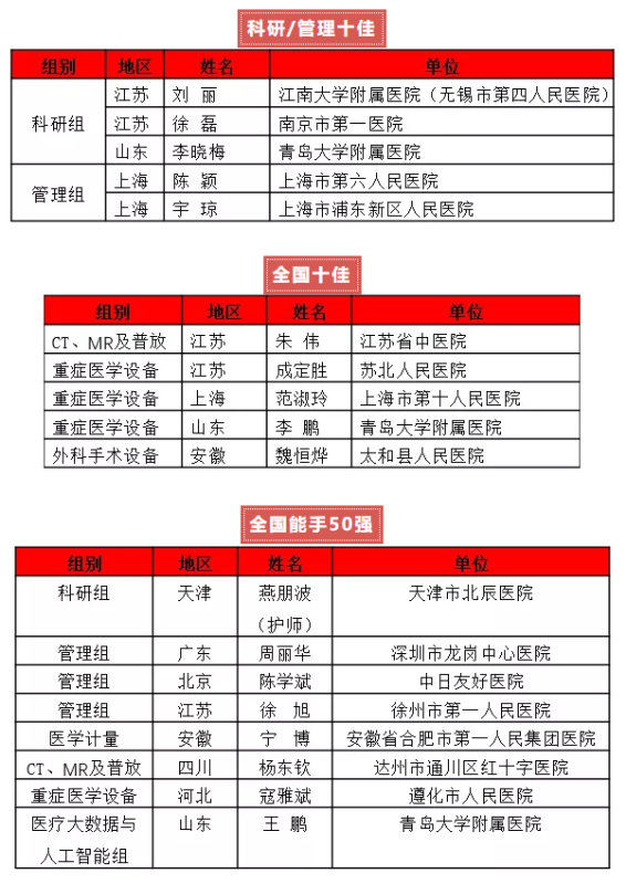 “中国好医工”中国优秀临床工程师(全国能手50强):8人