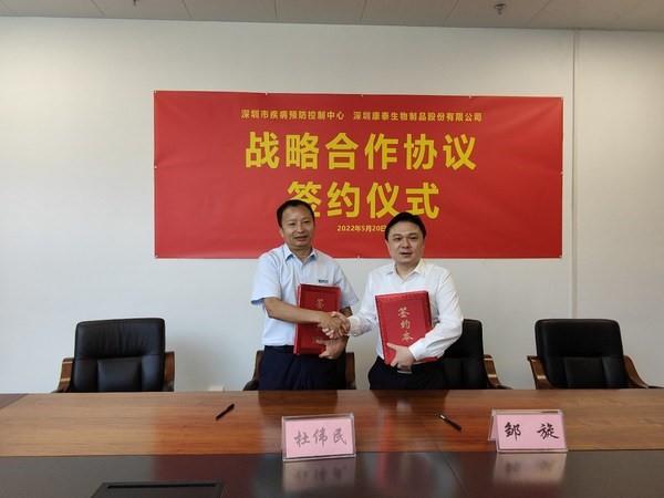 深圳市疾控中心党委书记、主任邹旋;康泰生物董事长杜伟民共同出席此次签约仪式。