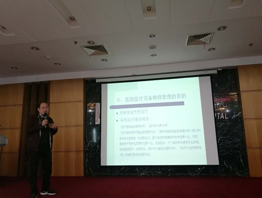 李庆先副院长讲解《医学计量检测校准与医学装备质量控制》,分析了医学计量与医学装备的关系,阐述了医学计量工作的重要作用。