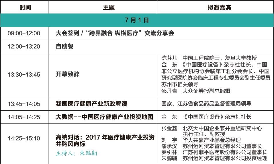 本着开放共享的互联网理念,为汇聚智慧、整合资源、推动合作、共赢发展,《中国医疗设备》杂志社携手《健康报》社、运河资本等多家机构将于2017年7月1-2日在苏州召开“第四届中国医疗健康产业投资并购峰会”。峰会将邀请近200位上市公司董监高、医疗企业代表、投资公司高管、专家学者、相关媒体、金融服务领域从业人员参与, 从不同角度论道当今中国健康产业投资与并购的走向。